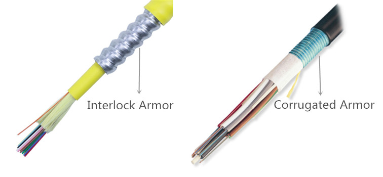 Cáp quang bọc thép có thể được chia thành hai loại theo ống kim loại: cáp quang bọc thép liên khóa và cáp bọc thép dạng sóng . Giáp lồng vào nhau là một áo giáp bằng nhôm được quấn xoắn ốc xung quanh cáp và được tìm thấy trong các cáp trong nhà và trong nhà / ngoài trời. Nó cung cấp độ chắc chắn và khả năng chống nghiền vượt trội. Giáp tôn là một băng thép tráng được gấp quanh cáp theo chiều dọc. Nó được tìm thấy trong các dây cáp ngoài trời và cung cấp thêm khả năng bảo vệ cơ học và loài gặm nhấm. Cả hai loại cáp quang bọc thép này đều cho phép lắp đặt ở những khu vực nguy hiểm nhất, bao gồm môi trường có quá nhiều bụi, dầu, khí, độ ẩm hoặc thậm chí là các loài gặm nhấm gây hại.
