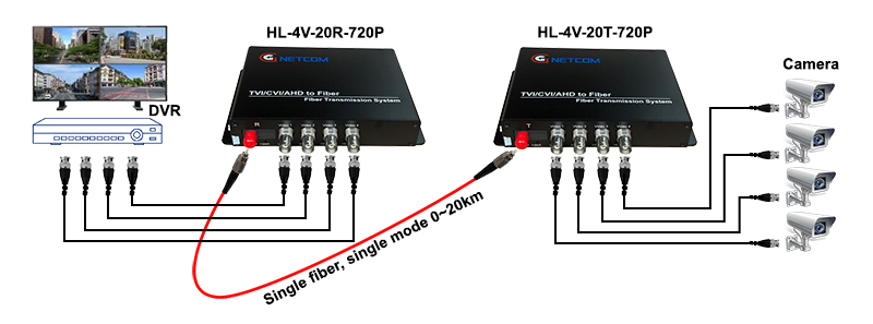 Bộ chuyển đổi video sang quang 4 kênh Gnetcom HL-4V-20T/R-720P được thiết kế cho ứng dụng thi công camera AHD/ HDCVI/ HDTVI với khoảng cách truyển hình ảnh xa từ 0- 20KM với 1 sợi cáp quang Single-mode, 0-2km với 1 sợi cáp quang multi mode