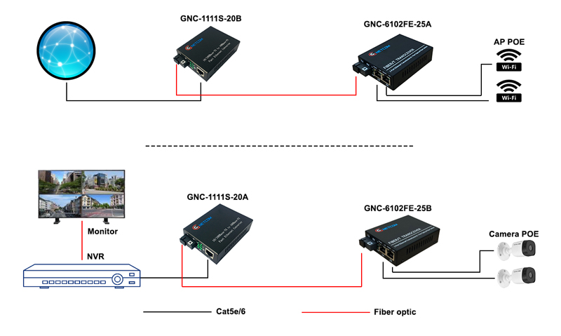Switch quang POE GNC-6102FE-25A/B cung cấp 1 cổng quang chuẩn SC hỗ trợ truyền tín hiệu qua cáp quang single mode với khoảng cách tối đa 25km. Switch quang POE hỗ trợ truyền tải tín hiệu qua cáp quang với bước sóng TX 1310nm (GNC-6102FE-25A) và bước sóng TX 1550nm (GNC-6102FE-25B)