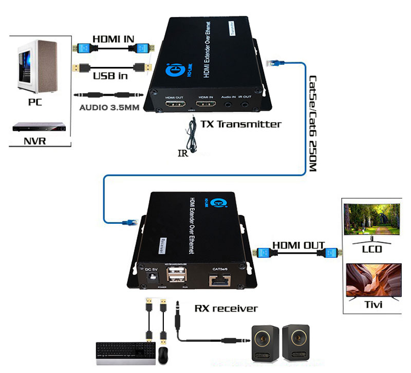 Làm thế nào để kết nối bộ mở rộng KVM ? Lấy bộ Ho-link HL-HDMI-200KVM được sản xuất bởi nhà sản xuất Ho-link làm ví dụ. HL-HDMI-200KVM là bộ mở rộng KVM có thể mở rộng tín hiệu HDMI và USB thêm 200 mét bằng cáp CAT5E,Cả6 tiêu chuẩn AWG24 và hỗ trợ độ phân giải 1080p.