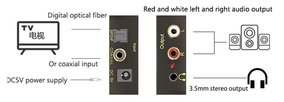 Nếu loa không có giao diện quang học và không hỗ trợ đầu vào âm thanh quang học, bạn cần sử dụng bộ chuyển đổi âm thanh có thể chuyển đổi âm thanh kỹ thuật số sang âm thanh tương tự (ở đây, lấy bộ chuyển đổi âm thanh kỹ thuật số sang tương tự DAN làm ví dụ). Kết nối giao diện quang kỹ thuật số của TV với giao diện quang của bộ chuyển đổi âm thanh bằng cáp quang, sau đó sử dụng một đầu của cáp âm thanh đầu nối bông sen để kết nối các kênh trái và phải màu đỏ và trắng của bộ chuyển đổi và đầu kia vào đầu vào kênh trái và phải của âm thanh hoặc Sử dụng cáp âm thanh 3,5 mm sang đầu bông sen, đầu đực 3,5 mm được kết nối với đầu cái ra âm thanh 3,5 mm của bộ chuyển đổi âm thanh và đầu bông sen được kết nối với đầu vào kênh trái và phải của loa.